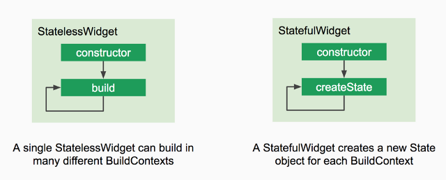 Widget privi di stato (statelesswidget): sono immutabili, come una classe statico. Un bottone che non cambia mai colore può essere definito come uno widget statico, può essere utilizzato anche nel caso abbiamo bisogno di mostrare solo descrizioni non interattive.