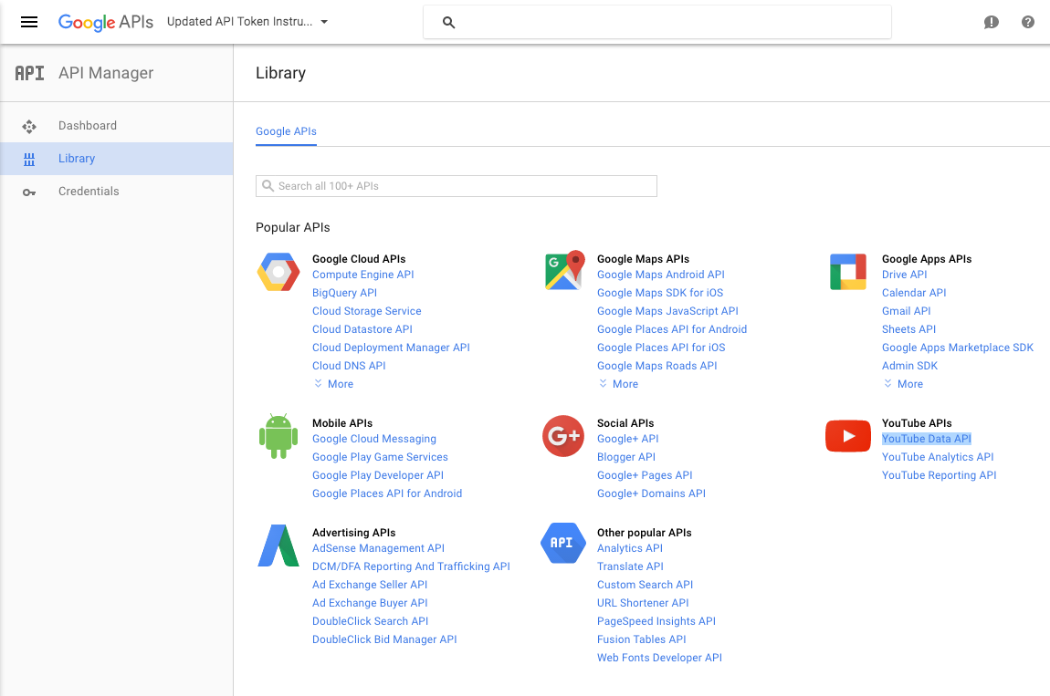 Clicca sul link delle Google API nella libreria delle API e cerca oppure seleziona le api youtube come evidenziato nella foto di seguito