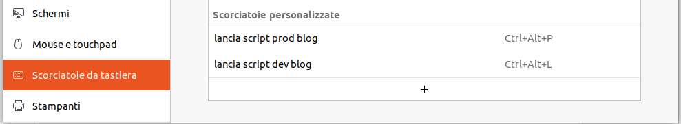 In linux ma anche su Windows e molto semplice settare una una scorciatoia. Nel mio caso usando Ubuntu basta andare sotto *impostazioni *-> scorciatoie da tastiera e aggiungiamo il nostro nuovo parametro che conterà il path al nostro script e la scorciatoia desiderata. Come potete vedere nella seguente immagine, io lo uso ad esempio per lanciare in debug il mio blog e successivamente per fare il deploy: